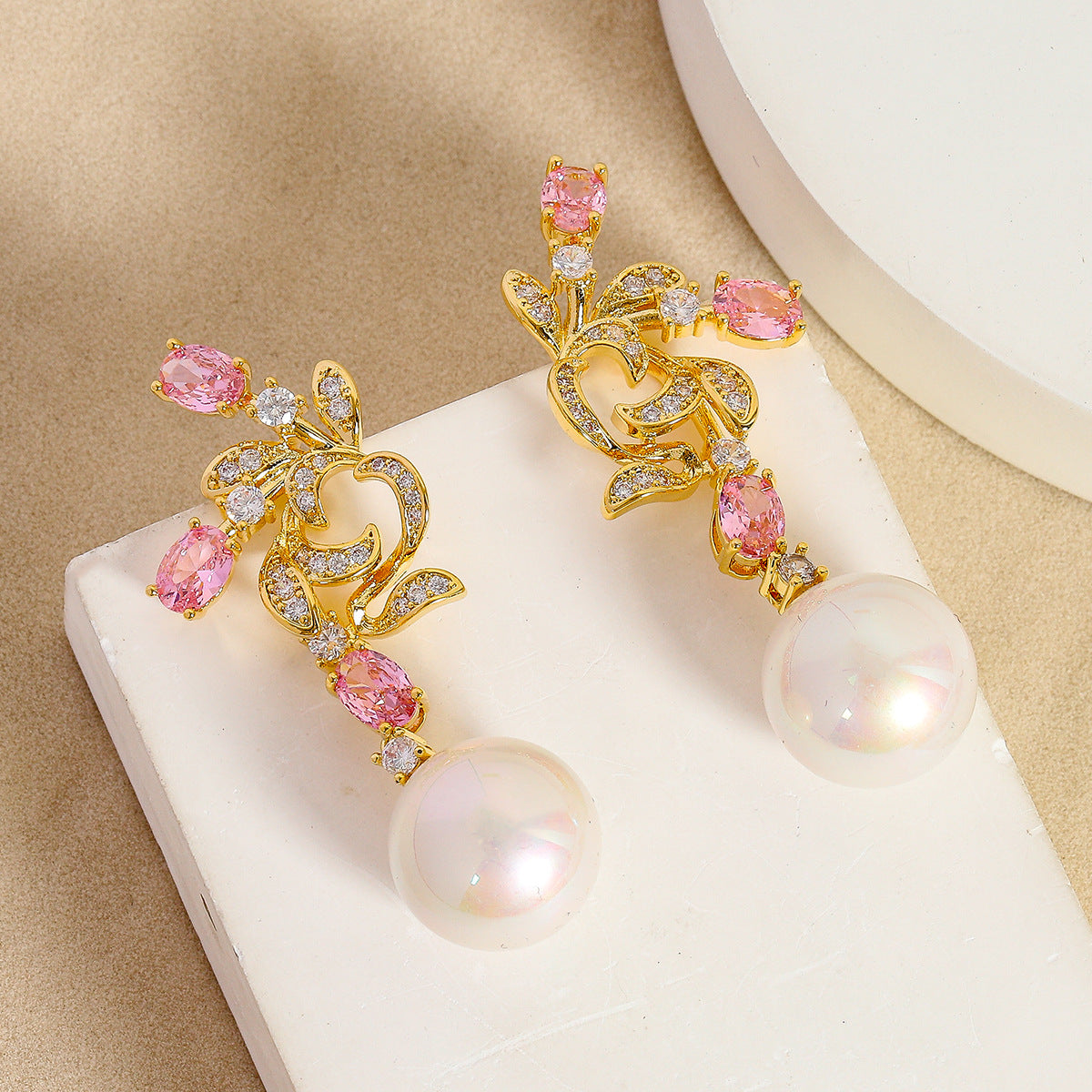 Exquisite and fashionable pink flower pearl-shaped design, high-end style, elegant and grand, unique ear stud