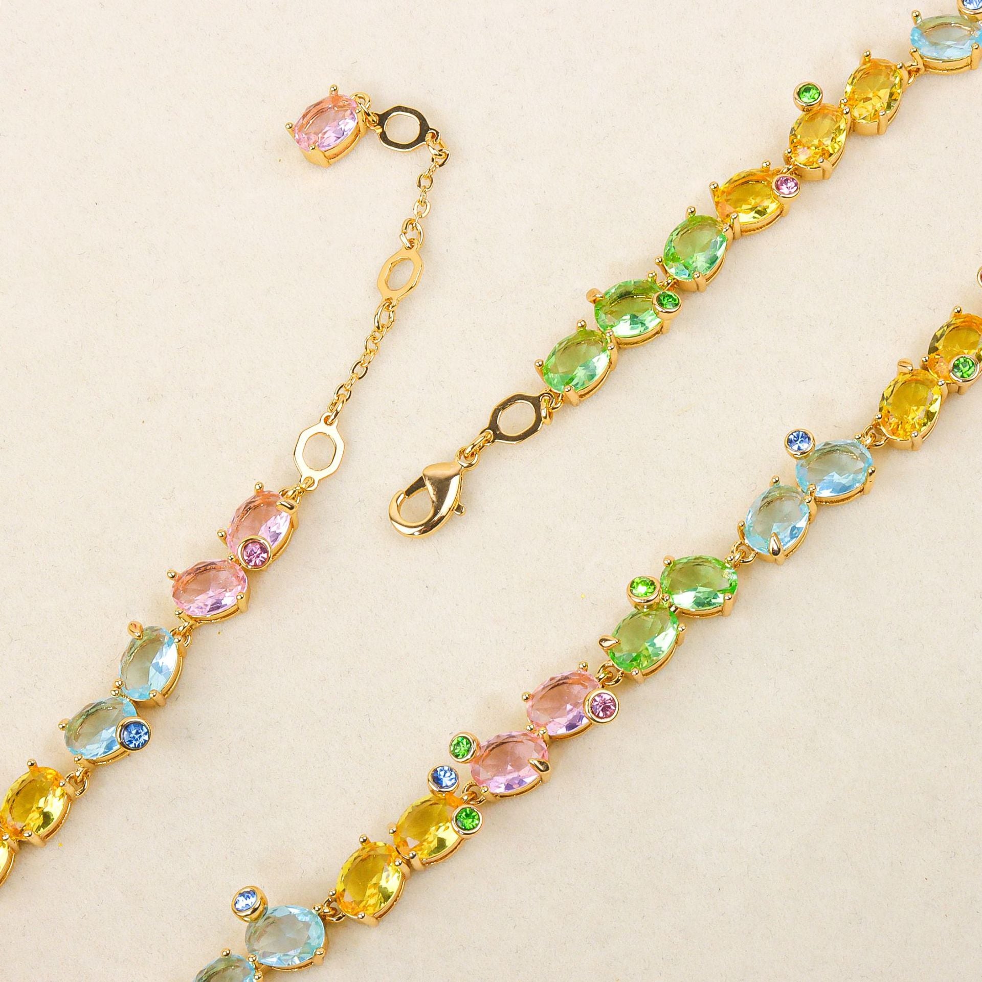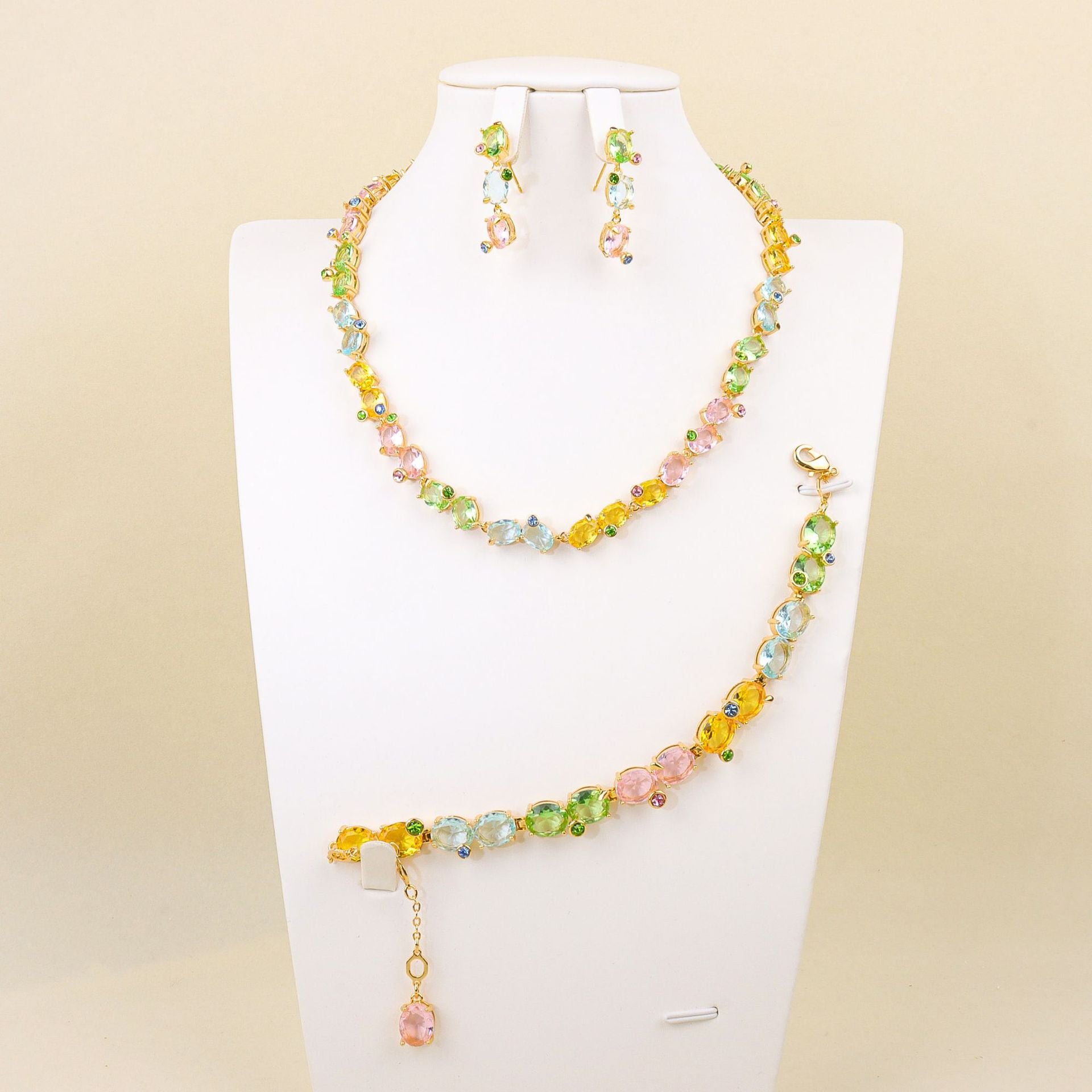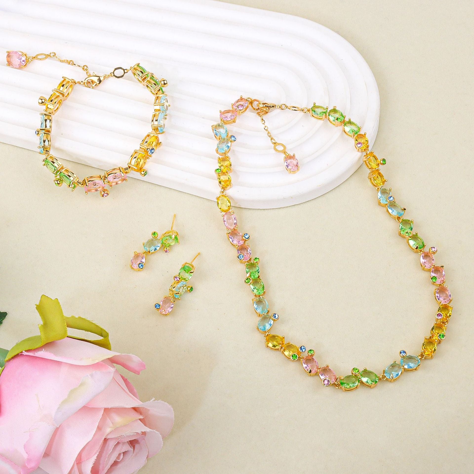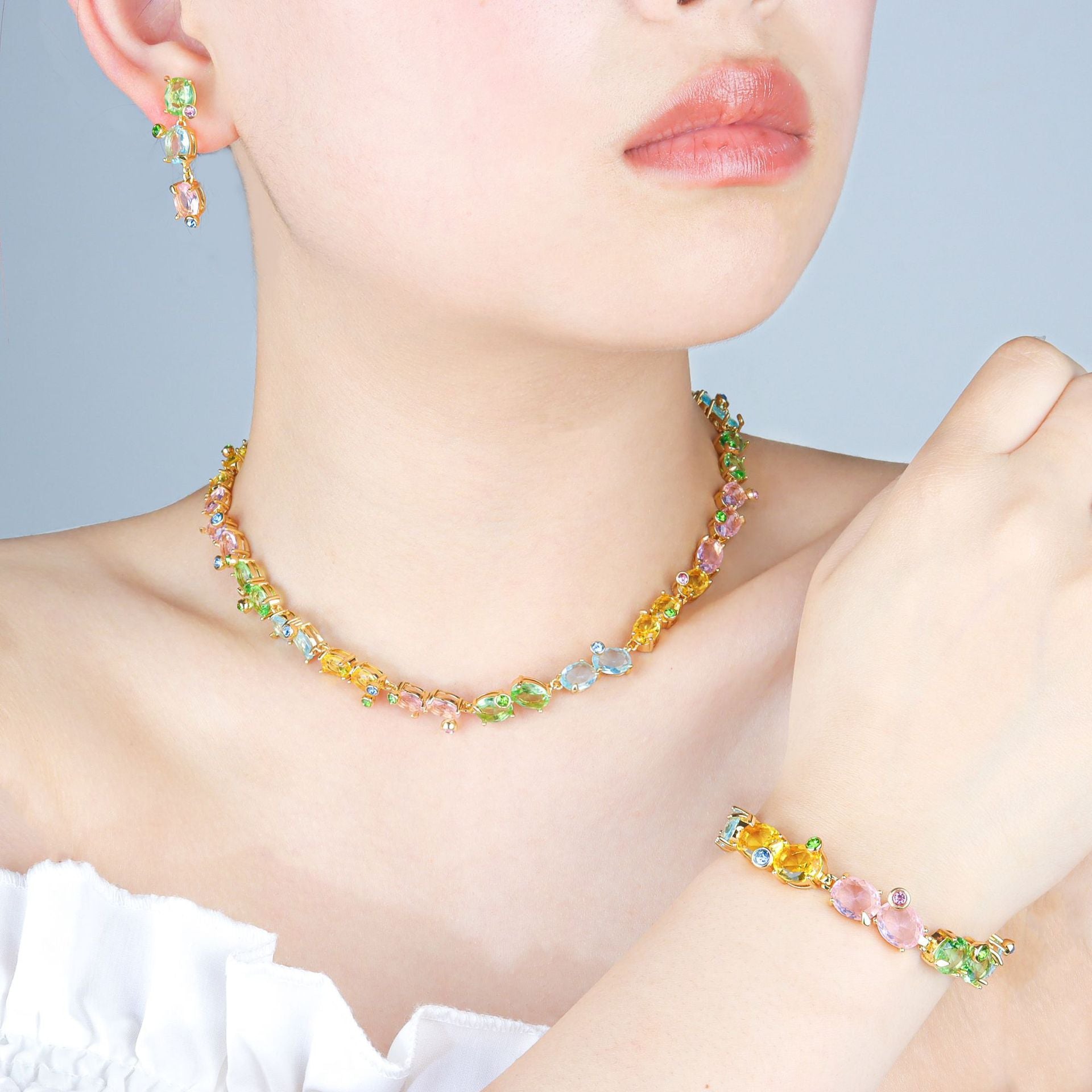 A unique and exclusive set of jewelry featuring color zirconia pieces arranged in an irregular pattern, with a small-scale and niche appeal.